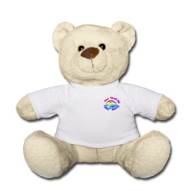 Teddy in hellem, samtigem Plüschfell, mit einem bedrucktem T-Shirt bekleidet, 100% Polyester, Marke: Toys Tower