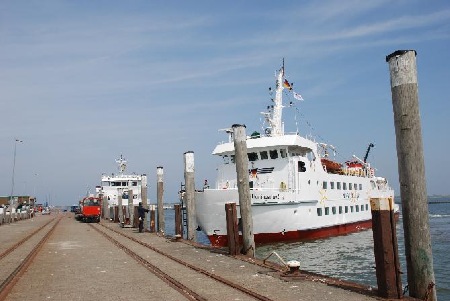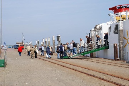 Umsteigen der Passagiere vom Schiff in die Inselbahn am Anleger von Wangerooge.