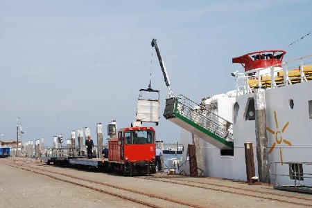 Umladen der Gepäckcontainer vom Schiff auf die Inselbahn und herunterklappen der Gangway.