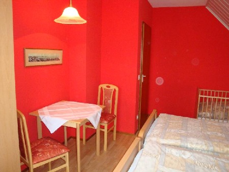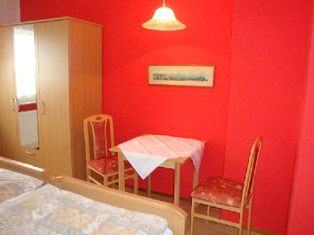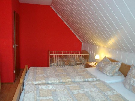 Das Rote Zimmerist ausgestattet mit zwei Betten mit Nachttischen, einem Kinderbett, einem dreitürigen Kleiderschrank mit Safe, sowie Tisch und zwei Stühlen.Ein zusätzliches Reisekinderbett kann in einem der Schlafräume aufgestellt werden.