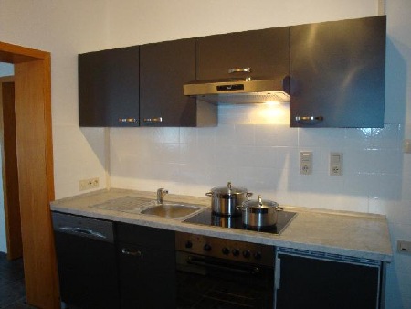 Küchenzeile mit Spülmaschine, Backofen und Cerankochfeld sowie reichlich Geschirr, Töpfe, Besteck usw.
